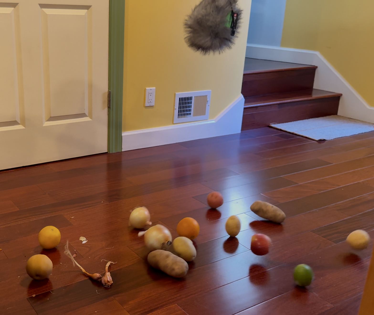 In Kitchen Score, one of the action instructions might be: “Dump a plate of potatoes onto the floor.”